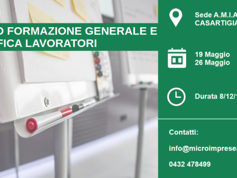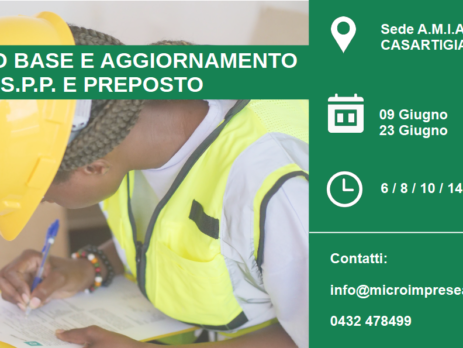 Comunichiamo l’avvio dei corsi di formazione obbligatori in oggetto: CORSO BASE DATORI DI LAVORO CON FUNZIONI DI R.S.P.P. PER CATEGORIE DI RISCHIO BASSO; CORSO DI AGGIORNAMENTO DATORI DI LAVORO CON FUNZIONI DI R.S.P.P. PER CATEGORIE BASSO, MEDIO, ALTO CORSO BASE E AGGIORNAMENTO PREPOSTO Per formalizzare l’iscrizione potete contattare la segreteria ai seguenti recapiti: E-mail info@microimpreseartigiane.it Tel 0432 478499
