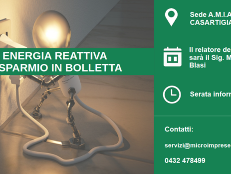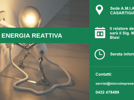 ENERGIA REATTIVA IN AZIENDA: COME RIDURLA con la presente comunichiamo che è stato programmato per martedì 07 maggio 2024 alle ore 17:00, un incontro informativo su che cos’ è l’energia reattiva e quando incide in bolletta. L’energia reattiva è l’energia elettrica che viene assorbita da macchinari, elettrodomestici e dispositivi connessi alla rete elettrica senza che essi siano in funzione, comportando perdite di rete che possono avere un impatto più o meno rilevante anche sulla bolletta.  Durante l’incontro, verranno, inoltre, illustrate le agevolazioni che [...]