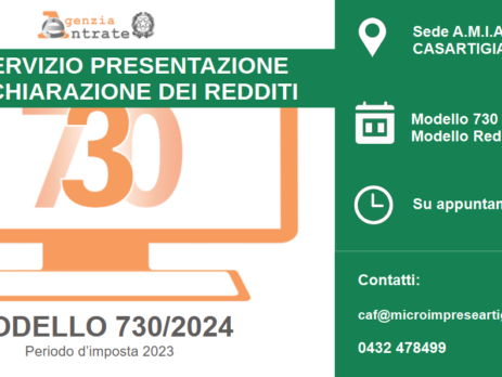 Informiamo che anche quest’anno abbiamo attivato il servizio di centro assistenza fiscale per l’elaborazione di pratiche fiscali per i lavoratori dipendenti e pensionati. Ricordiamo le seguenti scadenze: – Mod. 730/2023 → entro il 30/09/2024 – Mod. Redditi PF 2023 → entro il 30/09/2024 – I.M.U. 2023 → Acconto entro il 16/06/2024 Ai familiari e ai dipendenti delle imprese iscritte all’Associazione si riservano delle tariffe scontate. Per maggiori informazioni e per fissare un appuntamento: Tel: 0432 478499 Email: caf@microimpreseartigiane.it