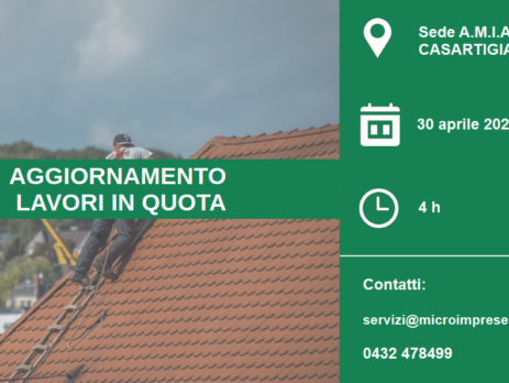 Comunichiamo l’avvio del corso di aggiornamento: AGGIORNAMENTO LAVORI IN QUOTA Il corso si terrà il giorno: martedì 30 aprile 2024 dalle 09:00 alle 13:00 presso la sede di A.M.I.A. UD – CASARTIGIANI  a Udine. Per maggiori dettagli e per conoscere il costo potete contattare la segreteria ai seguenti recapiti: E-mail: servizi@microimpreseartigiane.it Tel: 0432 478499   Segreteria Ufficio Formazione