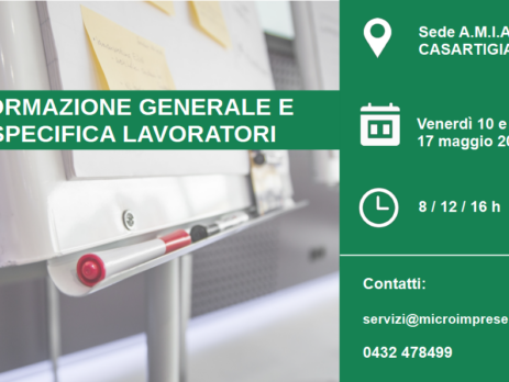 Comunichiamo l’avvio del corso di formazione obbligatorio: CORSO BASE E AGGIORNAMENTO FORMAZIONE GENERALE E SPECIFICA LAVORATORI (TUTTI I RISCHI) Il corso si terrà i giorni venerdì 10 e venerdì 17 maggio 2024 presso la sede di A.M.I.A. UD. – CASARTIGIANI in Via Tavagnacco 83/4 a Udine. Per maggiori informazioni e per formalizzare l’iscrizione potete contattare la segreteria ai seguenti recapiti: E-mail servizi@microimpreseartigiane.it Tel 0432 478499