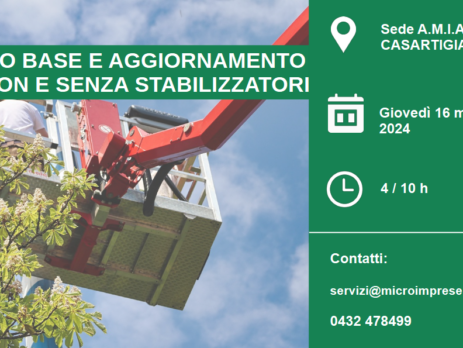 Comunichiamo l’avvio del corso di formazione obbligatorio in oggetto CORSO PER CONDUCENTI DI PIATTAFORME DI LAVORO ELEVABILI CON E SENZA STABILIZZATORI Il corso si terrà giovedì 16 maggio dalle ore 09.00 per la parte teorica presso la sede di A.M.I.A. UD – Casartigiani in Via Tavagnacco, 83/4 a Udine e per la parte pratica presso la Robicar di Fagagna (UD). Per formalizzare l’iscrizione potete contattare direttamente la segreteria ai seguenti recapiti: E-mail: servizi@microimpreseartigiane.it Tel: 0432 478499