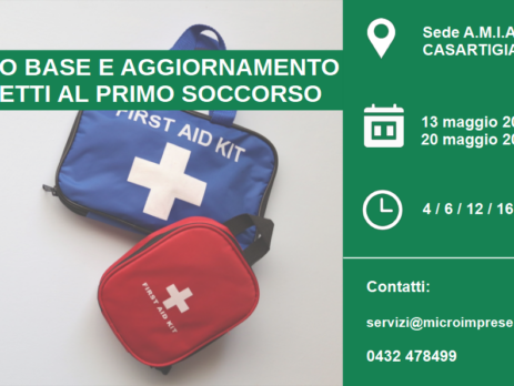 AVVIO CORSO DI FORMAZIONE BASE E AGGIORNAMENTO PER ADDETTI PRIMO SOCCORSO (Gruppo A e Gruppi B&C) – Si comunica che ci sono ancora posti disponibili per il corso di formazione obbligatorio in oggetto: CORSO BASE E AGGIORNAMENTO PER ADDETTI AL PRIMO SOCCORSO (Gruppo A e Gruppi B&C) Il corso si terrà presso la sede A.M.I.A. UD. – CASARTIGIANI in Via Tavagnacco 83/4 a Udine nei giorni di lunedì 13 e lunedì 20 maggio 2024. Per conoscere gli orari e modalità di l’iscrizione potete contattare direttamente [...]