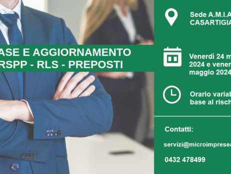 CORSI FORMAZIONE OBBLIGATORI R.S.P.P., R.L.S., PREPOSTO:  – Si informa l’avvio dei corsi di formazione obbligatori in oggetto: CORSO BASE E AGGIORNAMENTO DATORI DI LAVORO CON FUNZIONI DI R.S.P.P. PER CATEGORIA DI RISCHIO BASSO CORSO AGGIORNAMENTO DATORI DI LAVORO CON FUNZIONI DI R.S.P.P. PER CATEGORIE DI RISCHIO MEDIO E ALTO CORSO AGGIORNAMENTO PER RAPPRESENTANTE DEI LAVORATORI PER LA SICUREZZA CORSO BASE E AGGIORNAMENTO PREPOSTO I suddetti corsi si terranno presso la sede di A.M.I.A. UD. – CASARTIGIANI in Via Tavagnacco 83/4 a Udine. Per conoscere le date, gli [...]