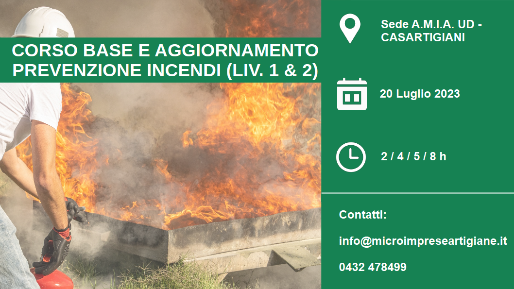 Il corso si terrà giovedì 20 luglio dalle ore 09.00 per la parte teorica presso la sede di A.M.I.A. UD – CASARTIGIANI in via Tavagnacco 83/4 a Udine e per la parte pratica presso B.T. ANTINCENDIO in via IV Novembre 44 a Feletto Umberto.