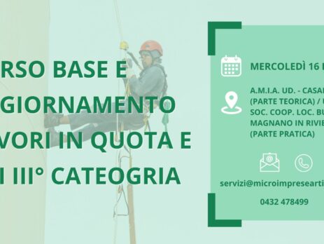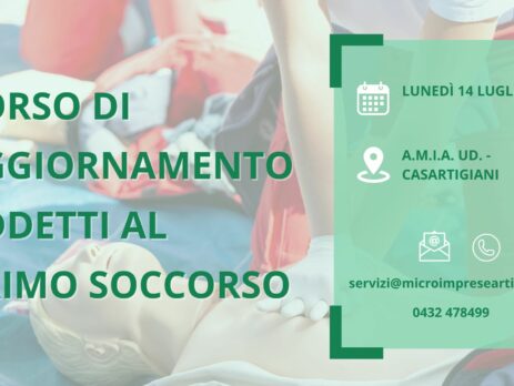 E’ stato programmato il corso di formazione obbligatorio in oggetto: CORSO AGGIORNAMENTO ADDETTI AL PRIMO SOCCORSO Il corso si terrà presso la sede A.M.I.A. UD. – CASARTIGIANI in Via Tavagnacco 83/4 a Udine (UD) il giorno lunedì 4 agosto a partire dalle ore 08:00. Il corso è aperto a tutti. Per maggiori informazioni o per procedere con l’iscrizione potete contattare la segreteria ai seguenti recapiti: E-mail: servizi@microimpreseartigiane.it Tel.: 0432 478499