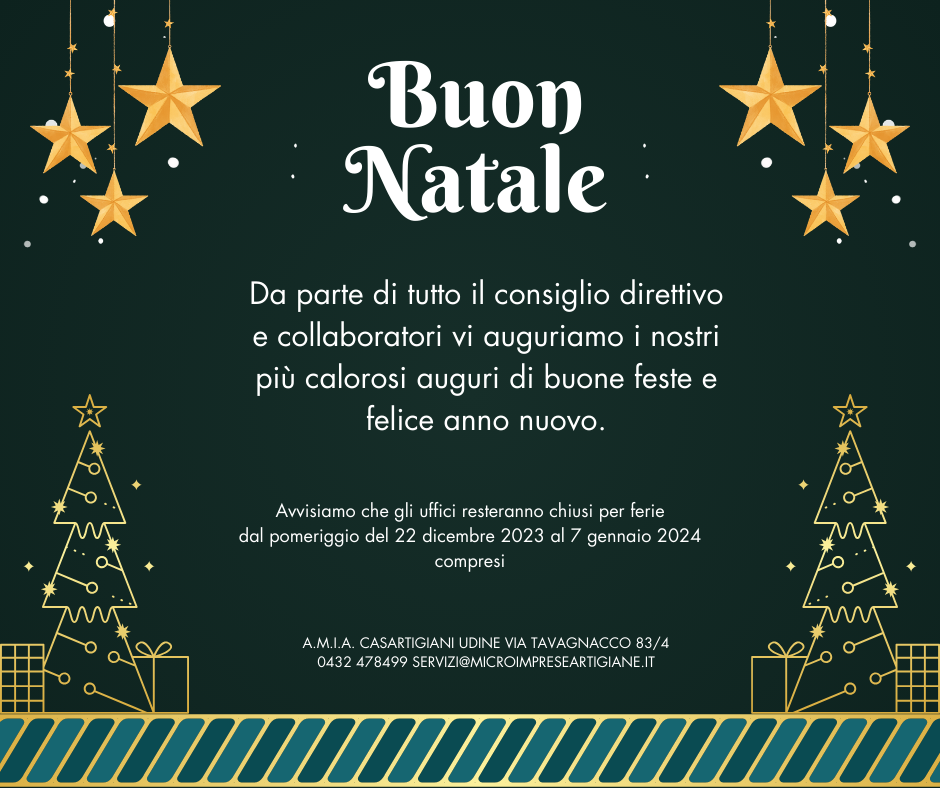 I nostri uffici resteranno chiusi per ferie dal pomeriggio del 22 Dicembre 2023 al 7 Gennaio 2024 compreso.
