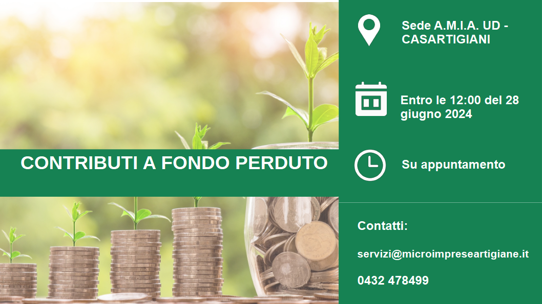 con la presente ricordiamo che fino alle ore 12:00 del 28 giugno 2024 sono stati fissati i termini per la presentazione delle domande di contributo a fondo perduto a sostegno di nuove imprese ed aspiranti imprenditori.